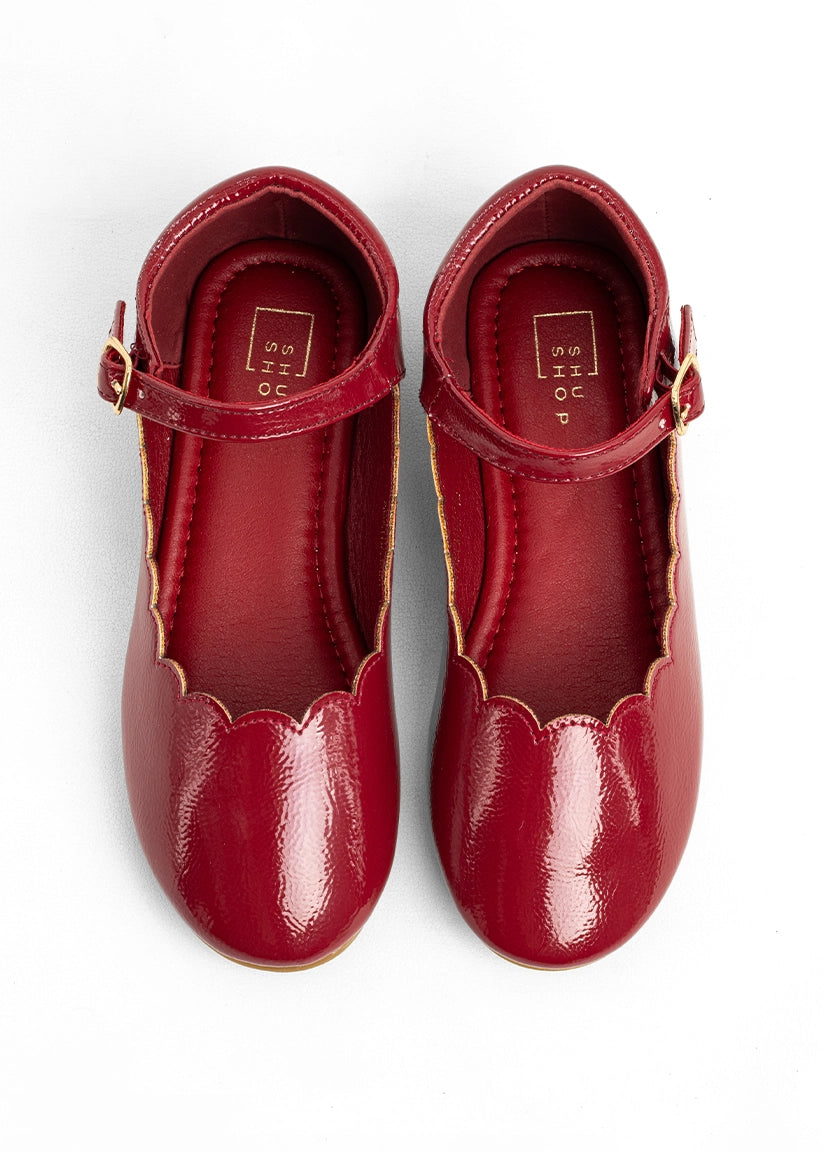 Upper: Glossy faux patent leather in berry red with scalloped trim