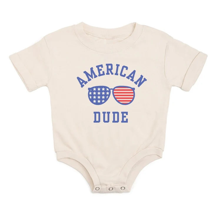 The American Dude Short Sleeve Romper is a fun and festive romper for babies celebrating the 4th of July or to show patriotic spirit any day!