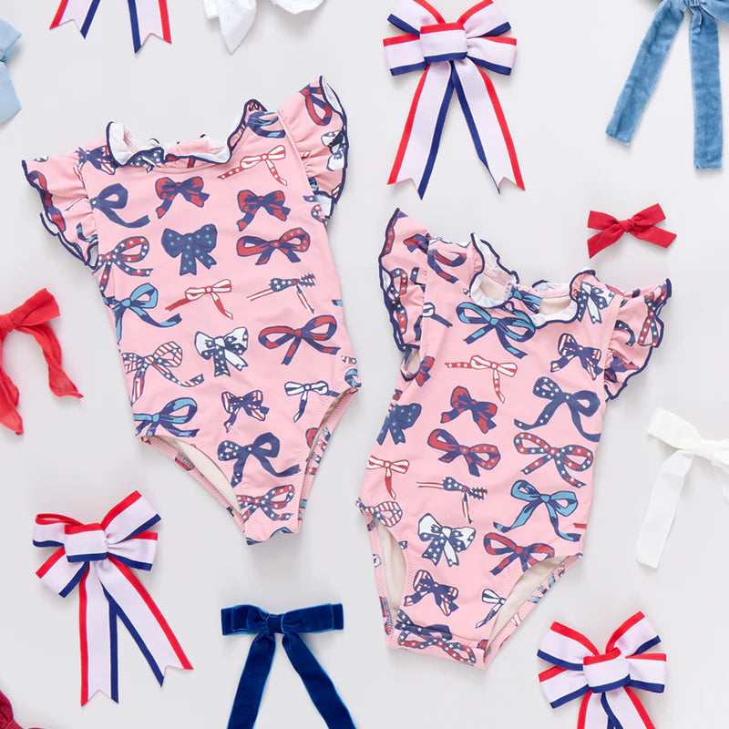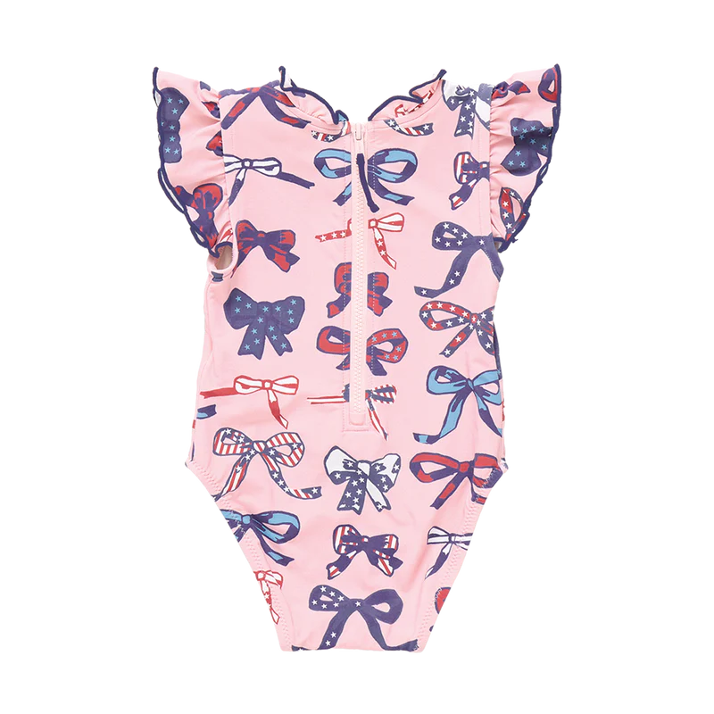 Summer Splash! An array of perfectly tied ribbons in shades of red, white and blue give a nod to the Stars and Stripes in our Pink Patriotic Bows conversation print shown here on our swan-dive-ready Baby Girls Jennifer Suit. Now crafted in a boosted 50+ SPF material, this delightful one-piece features a navy accented ruffle collar and sleeve. A 3/4 zipper closure at the back, with an easy to grab colored pull rounds out the look. Ring snap closure at the bottom allows for easy diapering. Twin with big sis in our Girls Jennifer Suit in Pink Patriotic Bows.