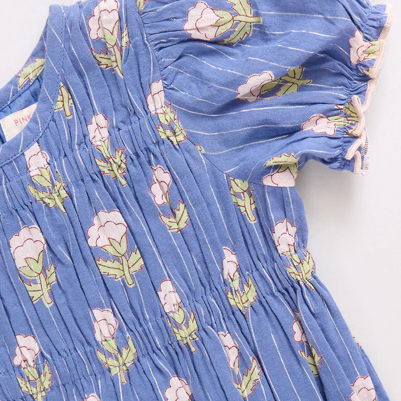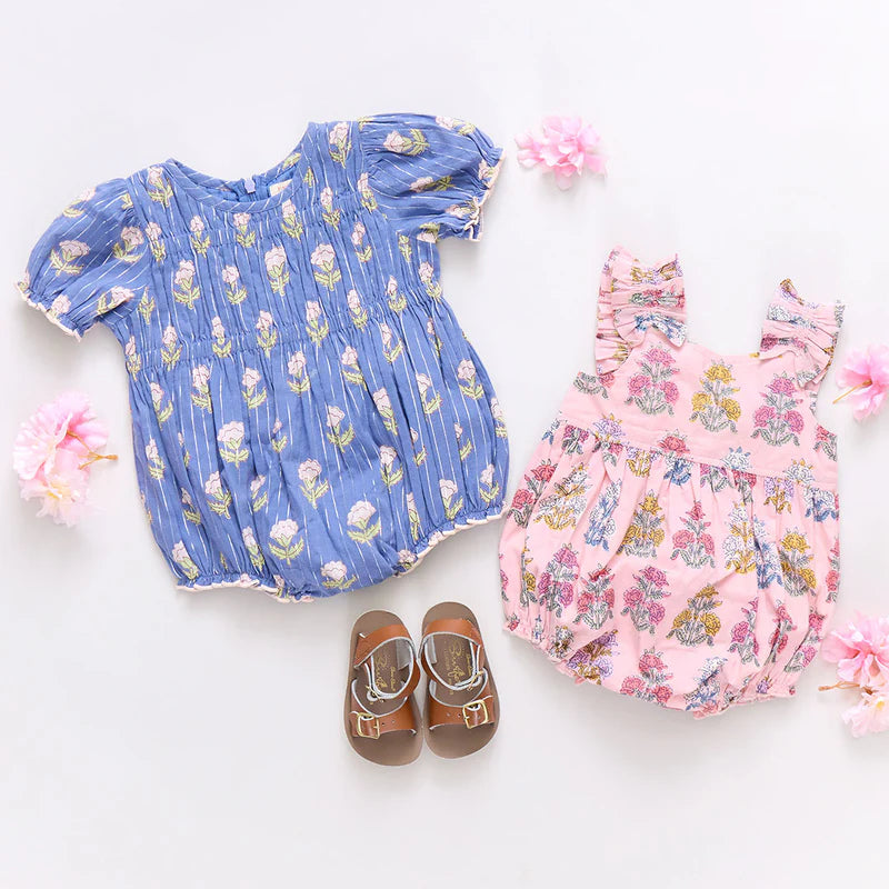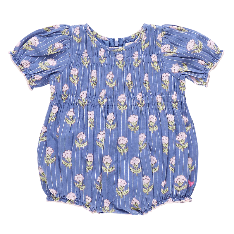 Budding Beauties! A spray of pink blossoms emerge from a rich blue field on our delightful Baby Girls Waverly Bubble in Periwinkle Small Bud.