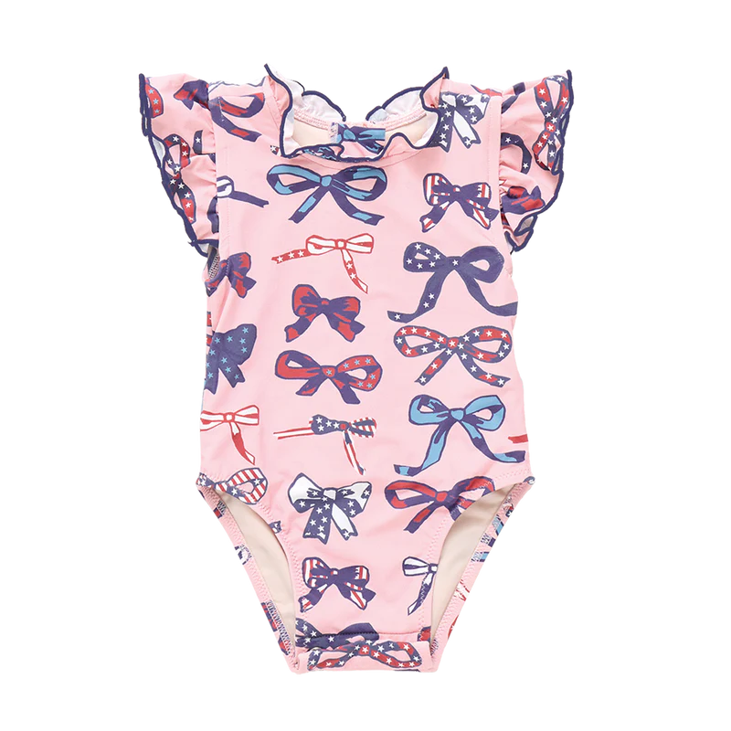 Summer Splash! An array of perfectly tied ribbons in shades of red, white and blue give a nod to the Stars and Stripes in our Pink Patriotic Bows conversation print shown here on our swan-dive-ready Girls Jennifer Suit. Now crafted in a boosted 50+ SPF material, this delightful one-piece features a navy accented ruffle collar and sleeve. A 3/4 zipper closure at the back, with an easy to grab colored pull rounds out the look. Twin with little sis in our Baby Girls Jennifer Suit in Pink Patriotic Bows.