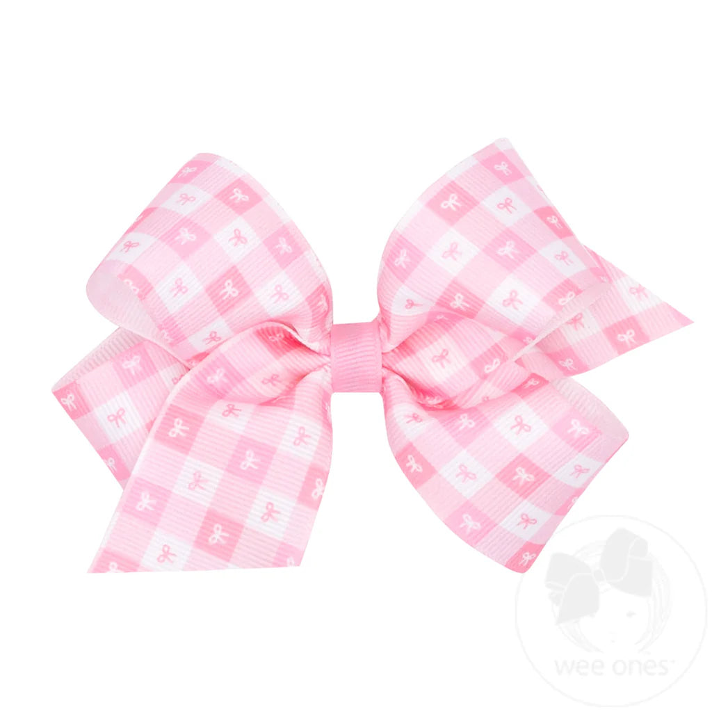 Medium Pearl Pink Gingham Bows Print Grosgrain Hair Bow