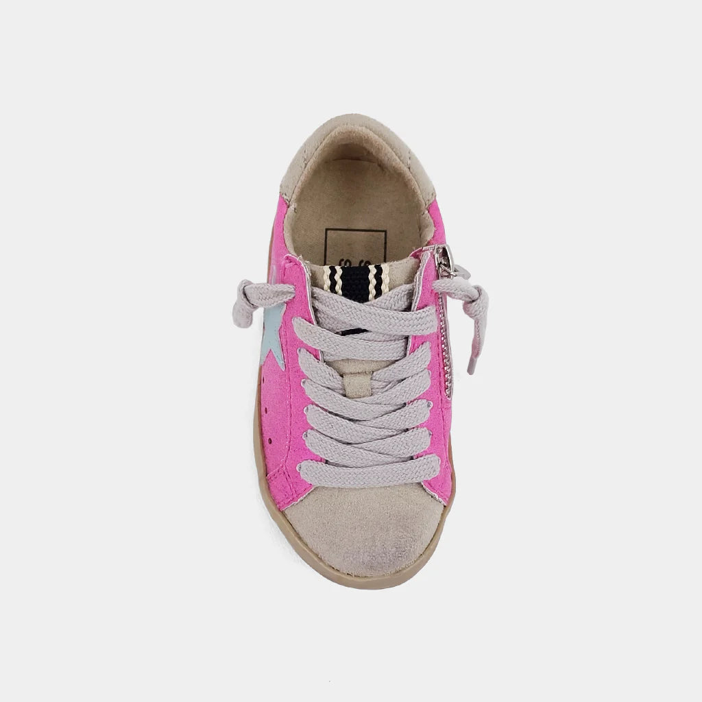 The PAULA MINI in Metallic Fuchsia stands out with its vibrant fuchsia body and a soft light blue star accent. Built for comfort with a sturdy sole and rounded toe, it's a fun and functional choice.