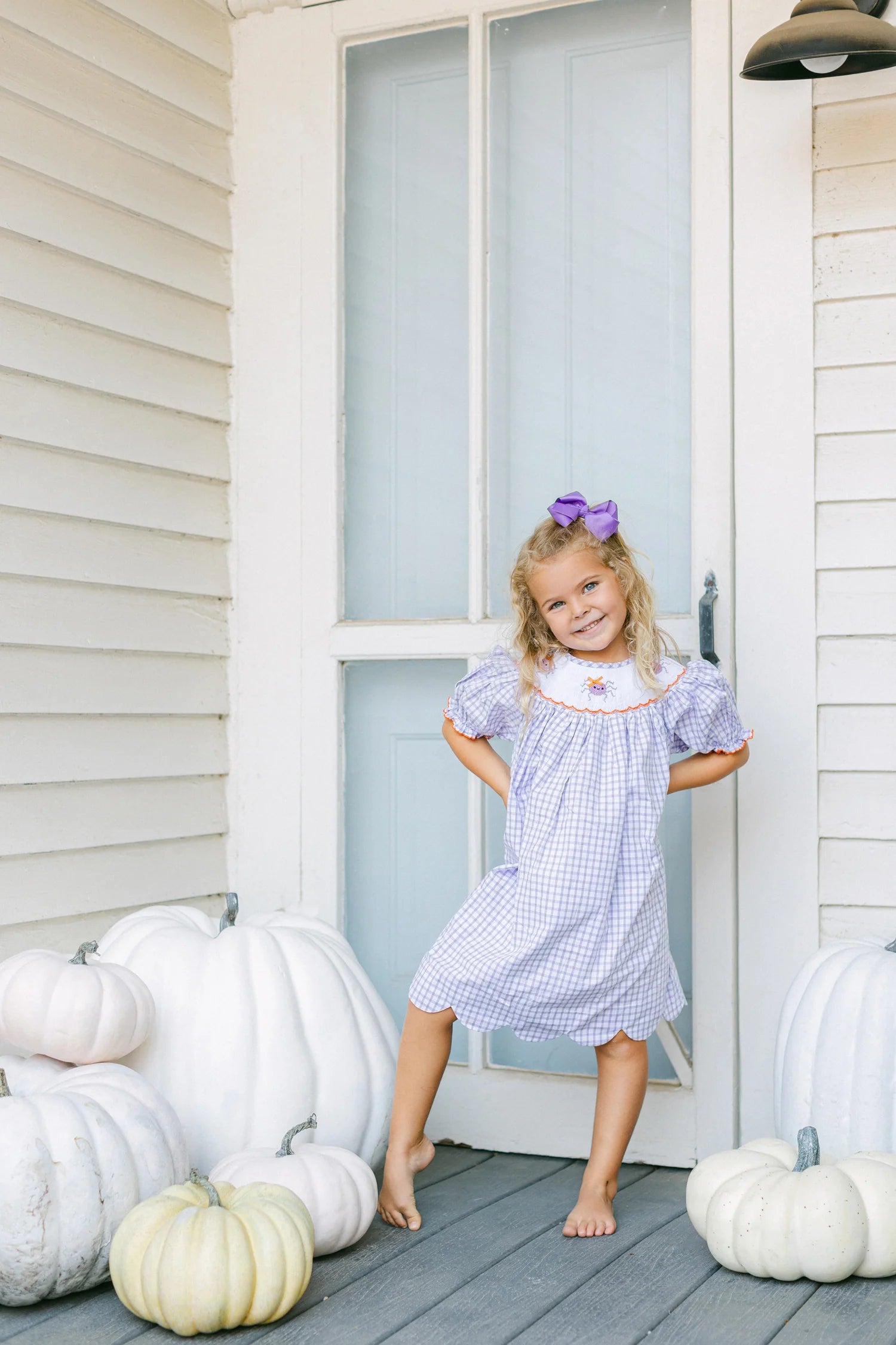 Who knew spiders could be so cute? This charming dress with purple spiders wearing orange bows is sure to become your little girl's favorite outfit this Halloween!