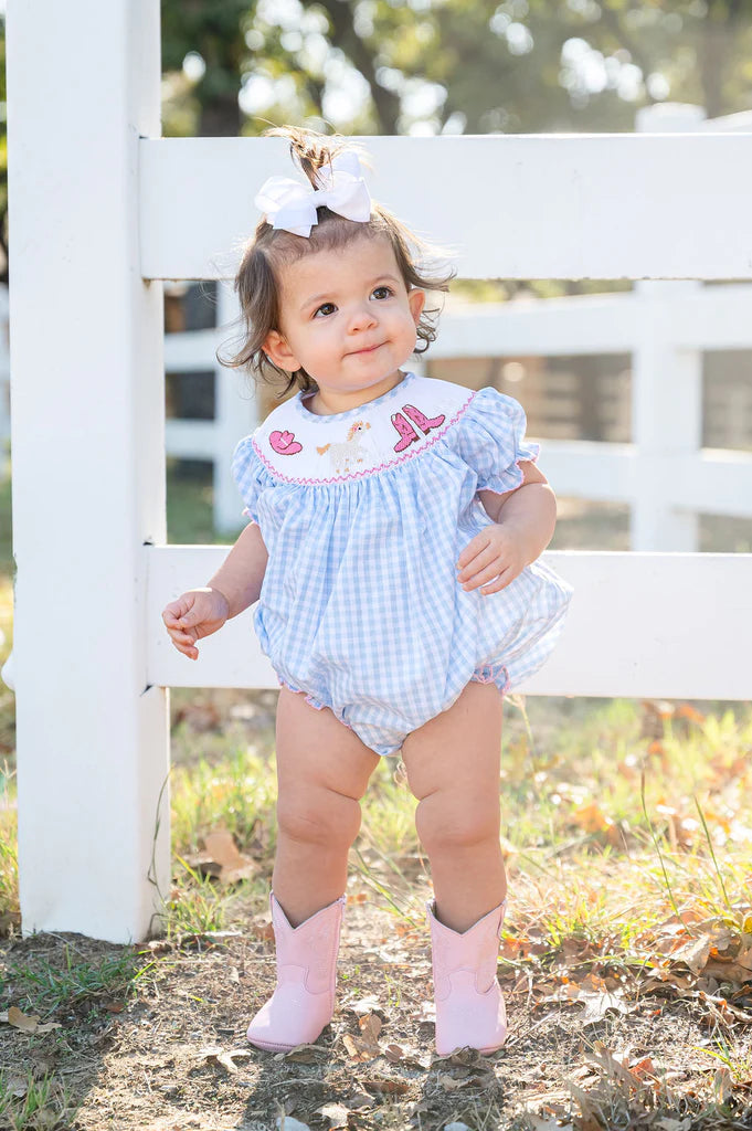 The Smocked Rodeo Western Bubble is a darling Southern staple made for your little cowgirl’s first rodeo. Crafted in classic blue gingham, this heirloom-style bubble features delicate hand smocking with pink cowgirl boots and hat, paired with a sweet horse finished with a pink bow. Full of Western charm, it’s a perfect choice for rodeos, first rodeo celebrations, Western-themed parties, and special moments worth remembering.