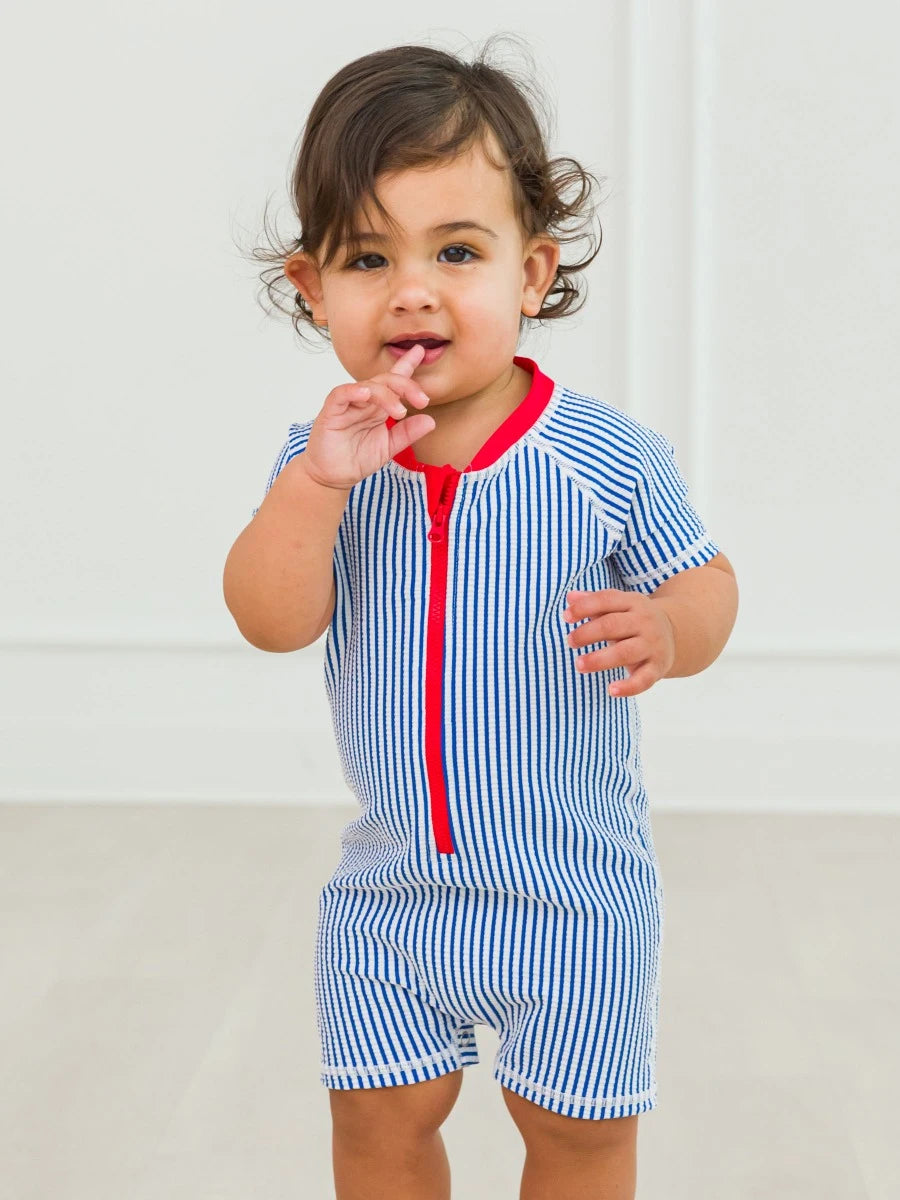 Blue Seersucker Short Sleeve One Piece Rash Guard is the ultimate choice for boys who love to swim and play under the sun. This blue polyester swimsuit features a convenient zipper closure, making it easy for quick changes or adjustments. Designed with boys' summer activities in mind, it incorporates UPF 50+ sun protection, ensuring your little one is shielded from harmful UV rays while enjoying the pool or beach.