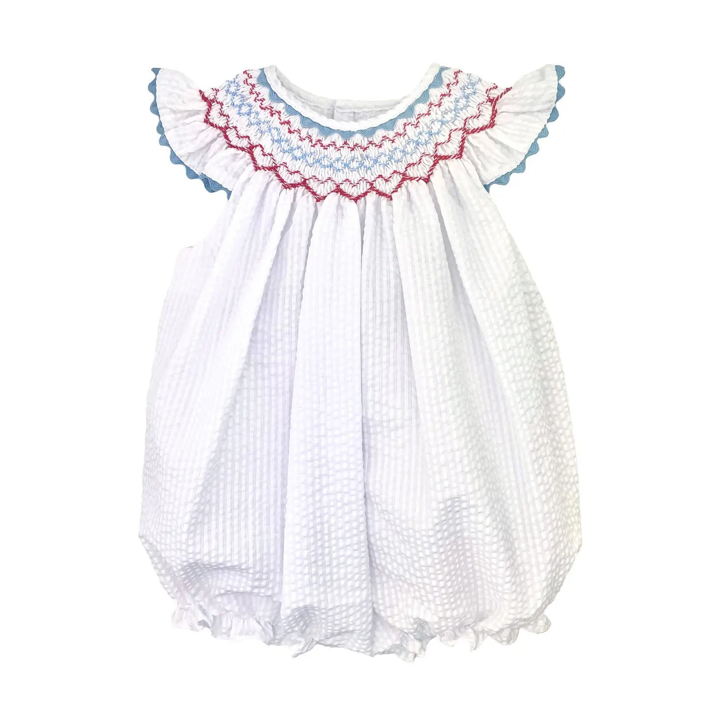 A classic summer outfit that is perfect for 4th of July celebrations or just plain old summer fun! This simple bubble comes in a white seersucker fabric with angel wing sleeves and patriotic red, white and blue bishop smocking. Perfect for hot summer days and summer celebrations! Made with a cotton-poly blend fabric that is light weight and easy to care for - just machine wash and tumble dry.